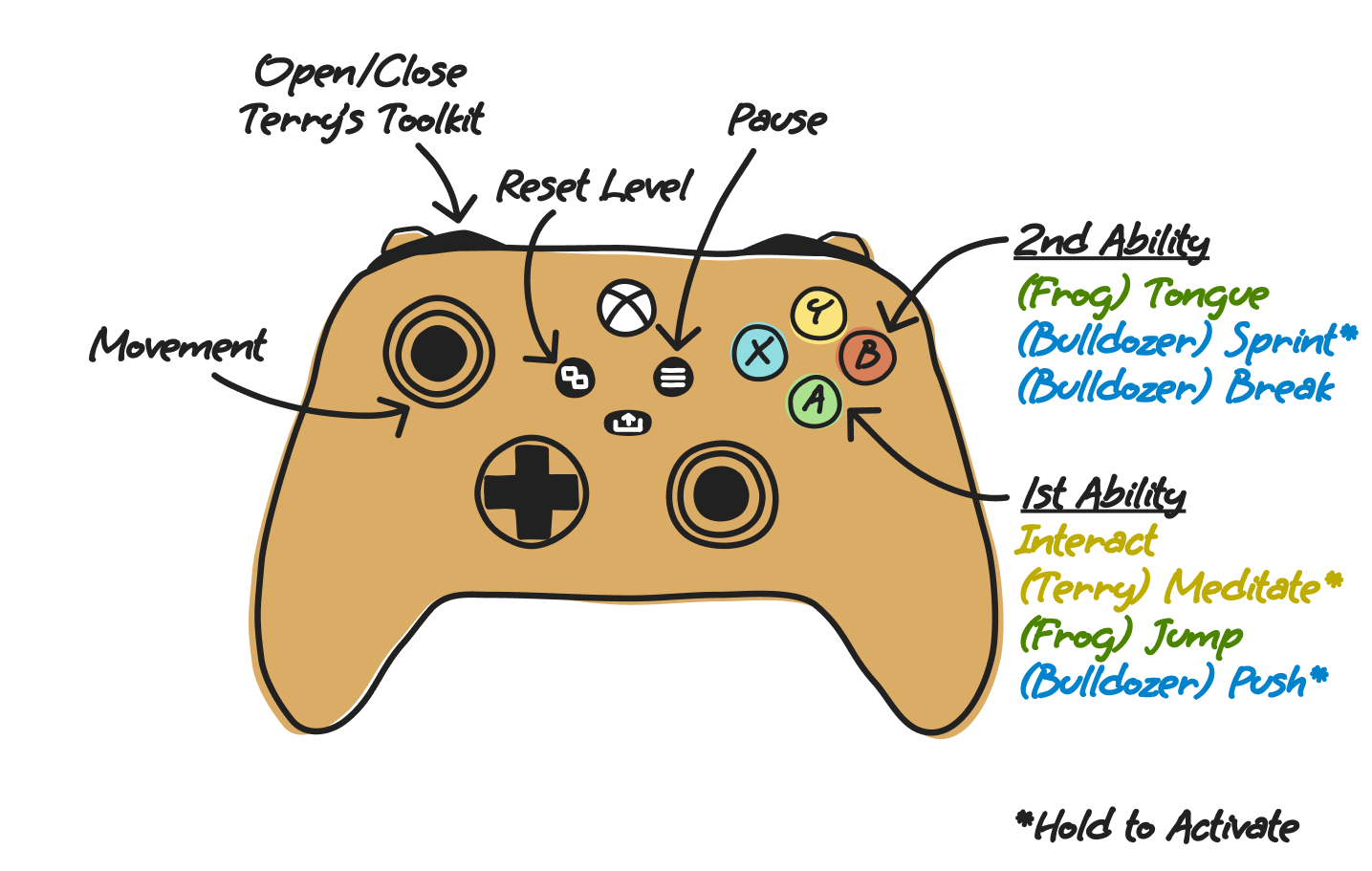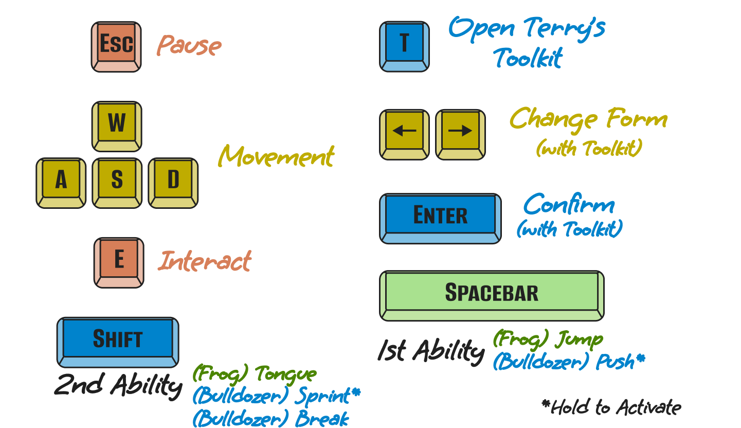 Terry must navigate through an unfamiliar environment and overcome various obstacles to get through his first day at the office. As Terry, the player can transform into either a frog or a bulldozer (both with their own unique set of abilities). However, transformations come at a price so don't wear yourself too thin. Balance your abilities as you journey through a 90s inspired office desk on Terry's quest to return home.
